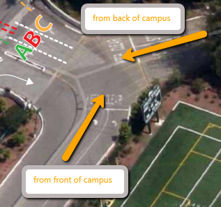 There are two exit lanes at the intersection of Saratoga Ave. and campus: one for people coming from the front of campus and one for those coming from the back of campus. When you are exiting the campus, you must come to a complete stop at the stop sign and let the car in the other exit lane go in front of you. Alternating exits “left – right – left – right” like this is the fairest way to let everyone exit campus without one line of cars getting stuck waiting.